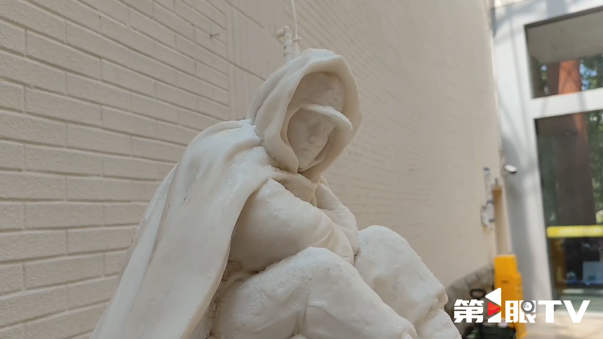 “这件名为《热血青春筑丰碑》的雕塑作品是我在2023年开始创作的,成功入选第十四届全国美展。当时正值中国人民志愿军抗美援朝战争胜利70周年,通过一系列影视作品,我被那段历史深深地震撼和打动了,就萌生了也创作一幅相关作品的想法。”西南大学美术学院2025届硕士研究生吴雯熙告诉第1眼TV记者,作品采用了树脂仿汉白玉,很好地模拟了雪地的场景,同时采用了三角形的构图,一名年轻战士怀抱钢枪,坐在高高的雪堆上打盹,整件作品就好像一座纪念碑。“想通过这样的形式向英雄们致敬,呼吁我们这代年轻人去学习父那种爱国情怀、舍小家为大家的精神。”