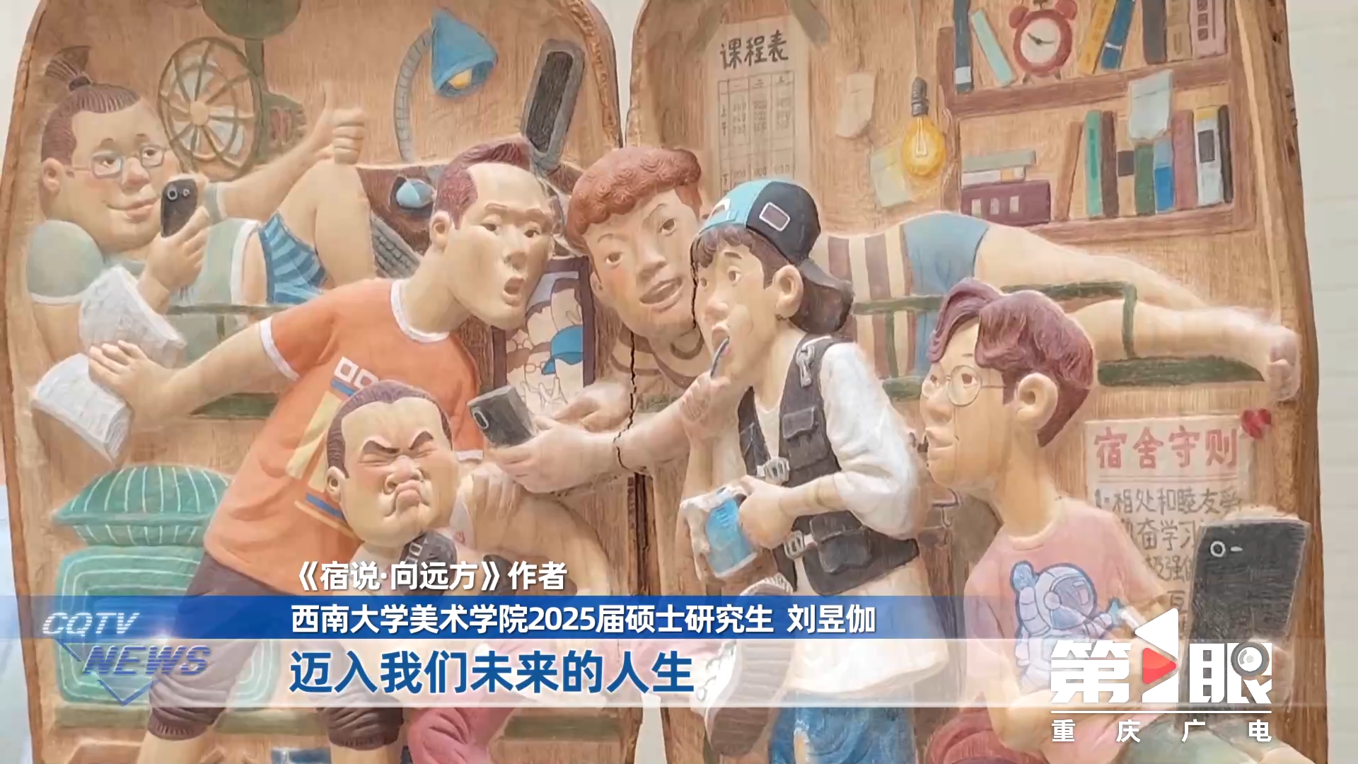同样入选第十四届全国美展的,还有这件名为《宿说·向远方》的木雕作品,“这张作品主要是以我大学的宿舍生活为主要题材,描绘了我们平时生活的场景。”西南大学美术学院2025届硕士研究生刘昱伽介绍说,“我以行李箱搭建了一个记忆空间,一方面是代表着我们也是从天南海北聚集到一个地方来求学,同时也代表着在毕业之后,我们也会进一步向前,迈入我们未来的人生。”