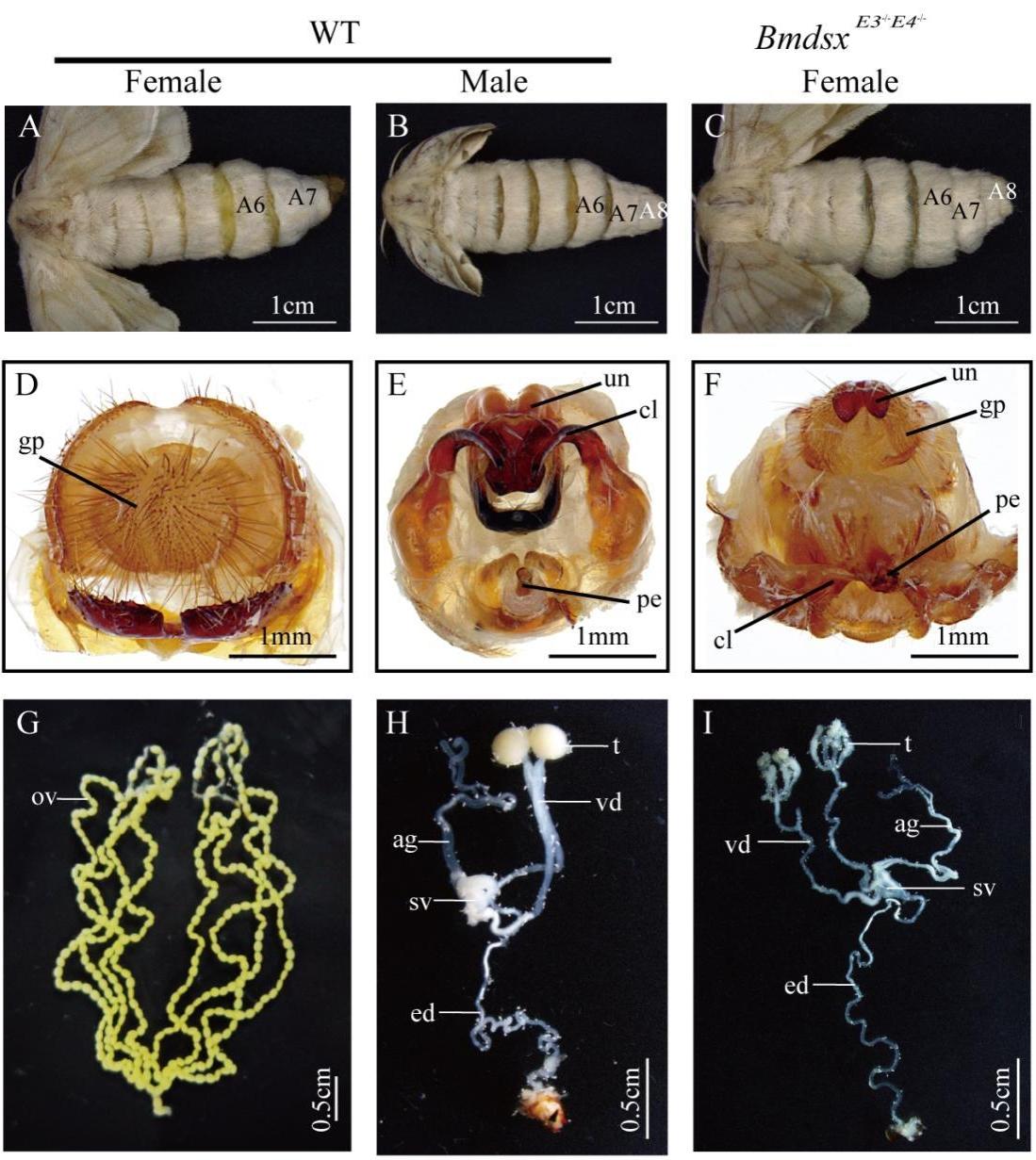 经过基因编辑的雌性家蚕(性染色体为ZW型)在成虫阶段发生了转变:原本7节的腹部变成了雄性特有的8节,长出了雄蚕才有的抱握器等生殖器官,甚至体内还发育出完整的精囊、输精管,能产生和雄蚕一样的精子。这一成果标志着家蚕性别控制技术取得重大突破,有望通过该技术培育更高产量和品质的品种,推动丝绸产业发展。