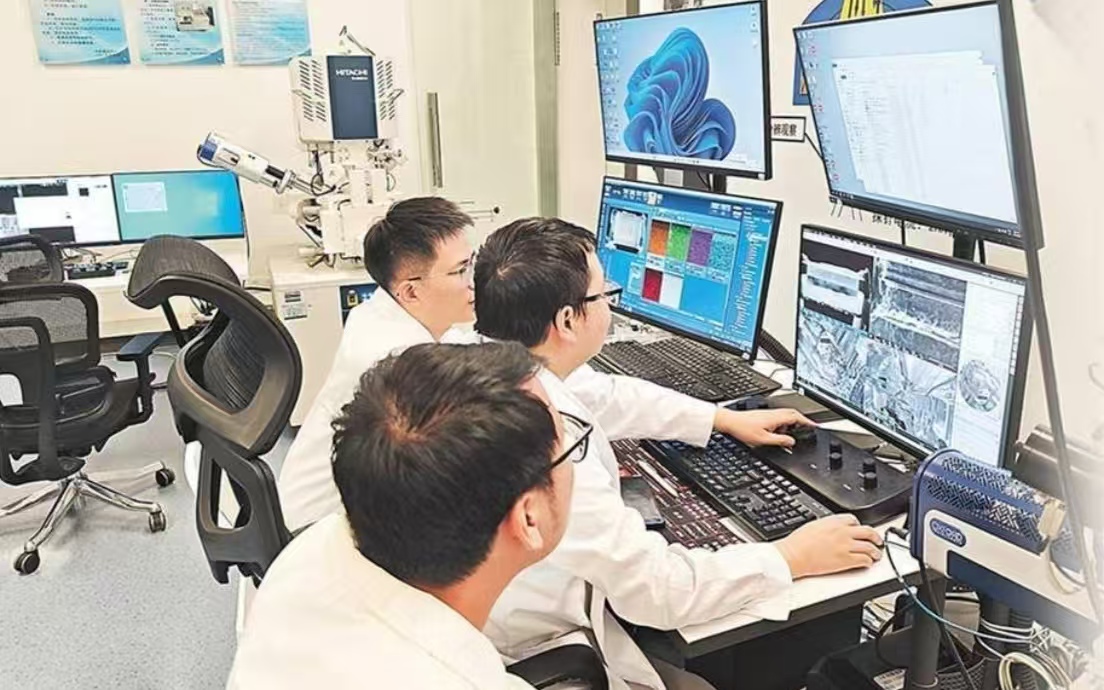 重庆大学分析测试中心工作人员和企业技术人员一起使用聚焦离子束扫描电子显微镜进行新材料开发。