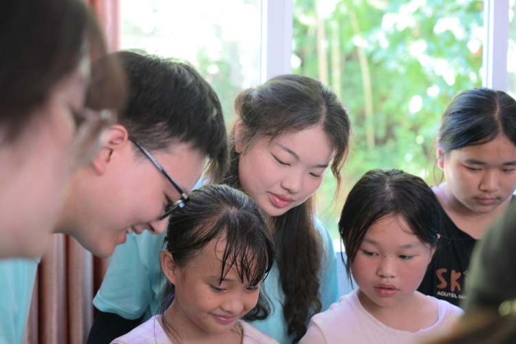 活动最后一天,队员们在村委会开设“非遗美育小课堂”。 他们以志愿者的身份,指导儿童制作凤鸟、体验扎染,并创新性融入双语互动,鼓励孩子们用外语描述家乡美景、讲述民俗故事。光明村驻村第一书记彭超也来到课堂现场,向队员们分享自己从城市返回家乡、投身基层服务的历程与感悟。他寄语队员们:“乡村天地广阔,需要知识,更需要情怀,希望你们能把根扎得更深些。”这场特别的课堂不仅为乡村儿童打开了接触中华优秀传统文化与外语的新窗口,也为青年学子理解乡村振兴的深层意义提供了生动参照。