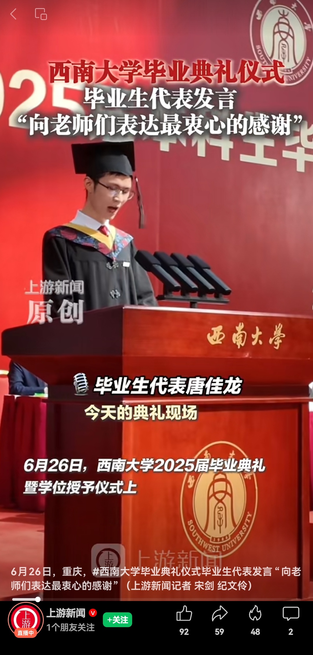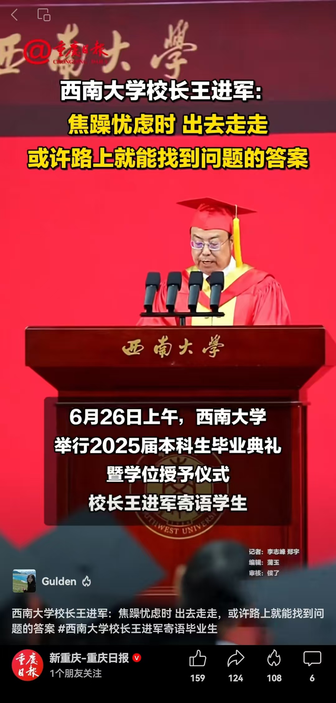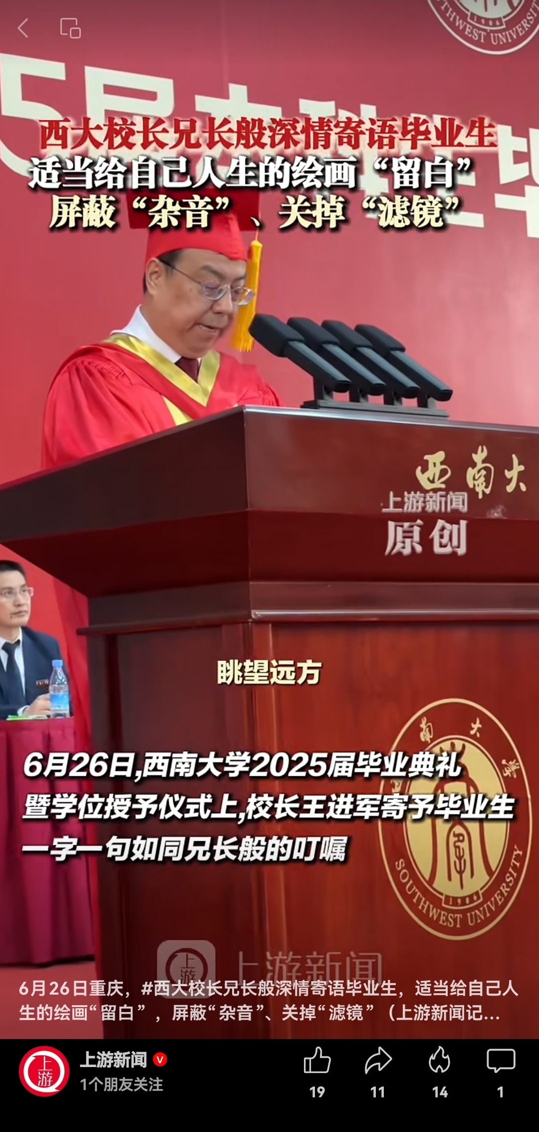 西南大学校长寄语学子:要学会屏蔽“杂音”,不人云亦云、不妄想捷径