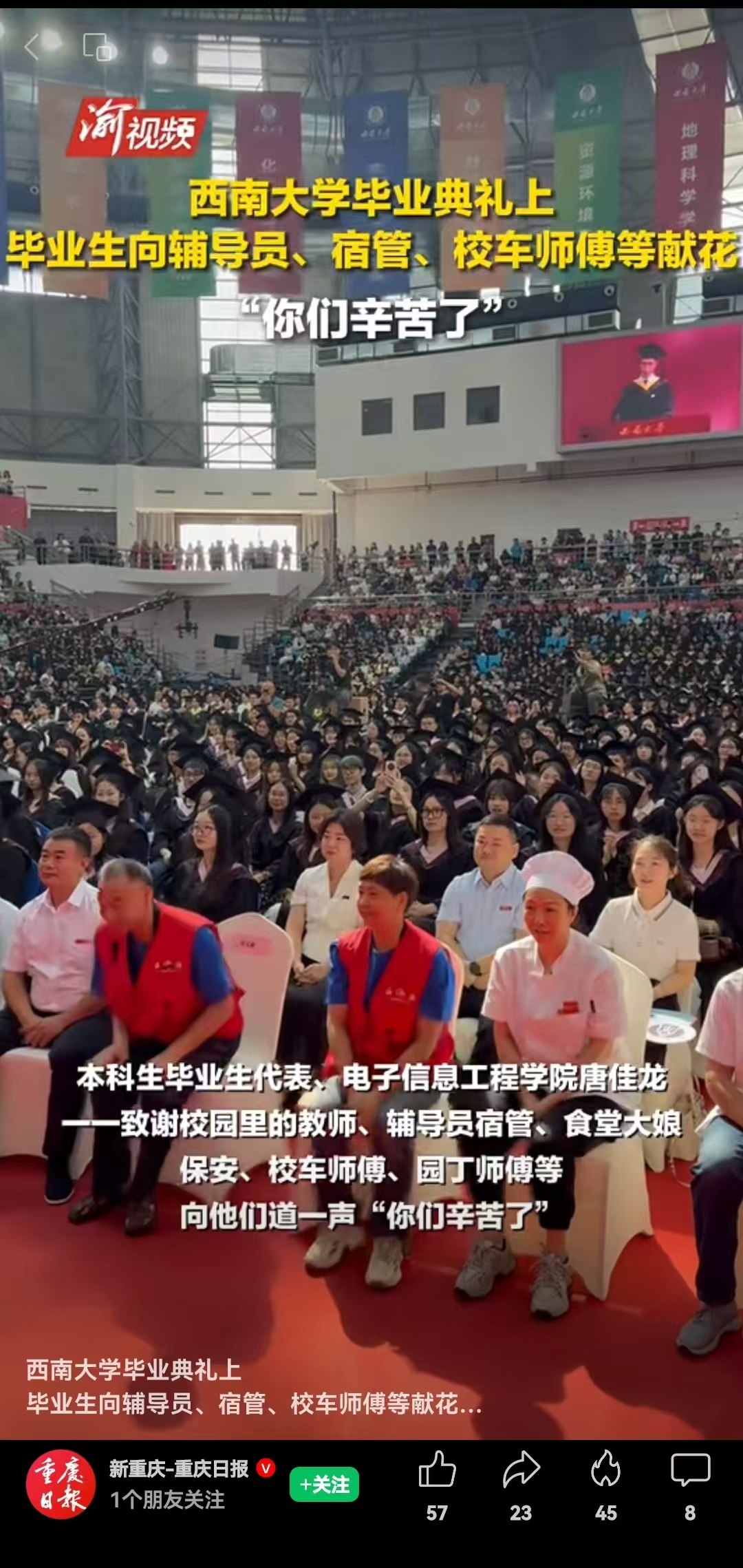 在讲话的结尾,他代表毕业生向老师、辅导员、医护人员、宿管阿姨、食堂阿姨、保安大哥、校车师傅、园丁师傅致谢,毕业生们派出代表献花,一一拥抱。当镜头聚焦到这些学生们每天都能看到,却叫不出名字的人,全场爆发出雷鸣般的掌声。